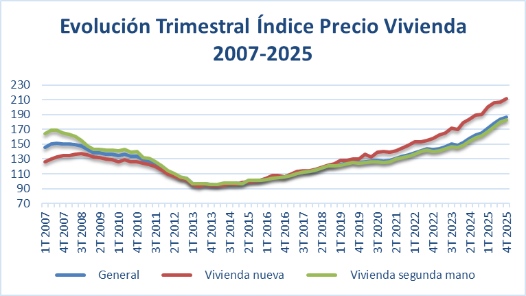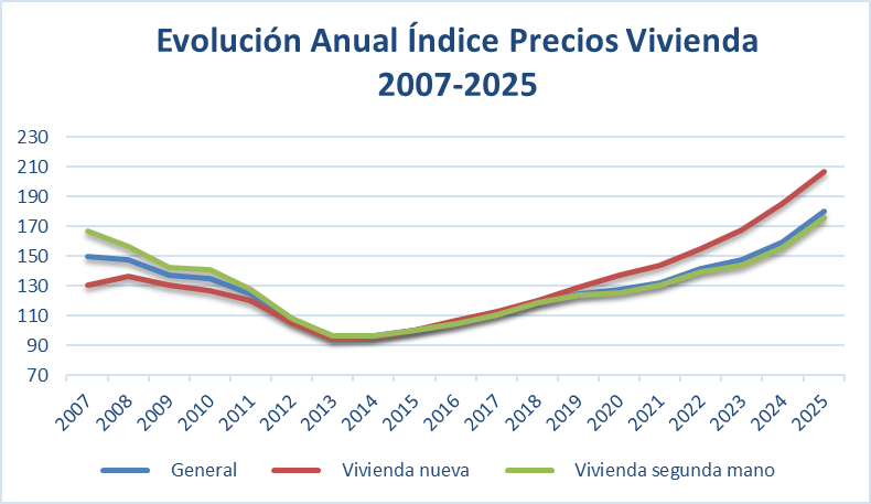 Veamos cuál es la evolución del índice precio anual de la vivienda en España desde el año 2007 al año 2025, así como a nivel trimestral (hasta el 4T 2025).