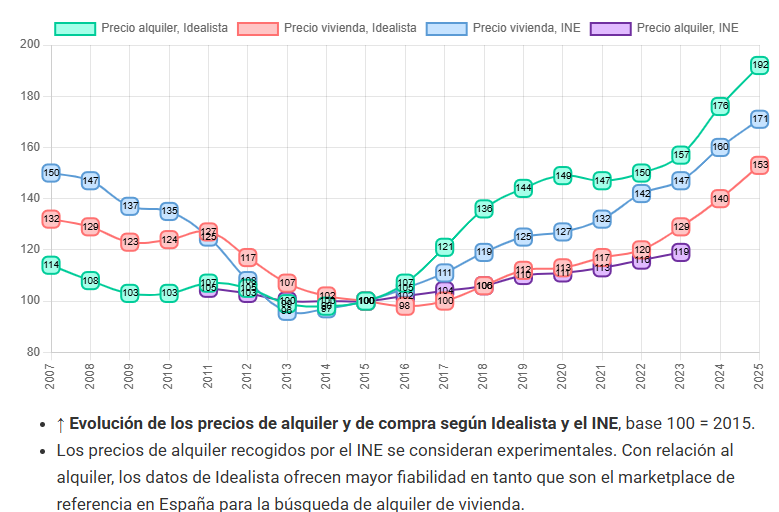 Por último, el siguiente gráfico muestra de manera conjunta la evolución del índice de precios de la vivienda y del alquiler en España según el INE e Idealista desde el 2007 al 2025 con base 0 en el año 2015: