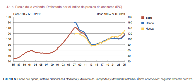 El siguiente gráfico (1985-2025) del último informe del Banco de España muestra cómo el precio de la vivienda —considerando la vivienda nueva y la usada— está todavía un 17,7% por debajo del pico alcanzado en la burbuja inmobiliaria del 2007. El dato corresponde al cierre del 2T 2025, por lo que la cifra actual es incluso menor.