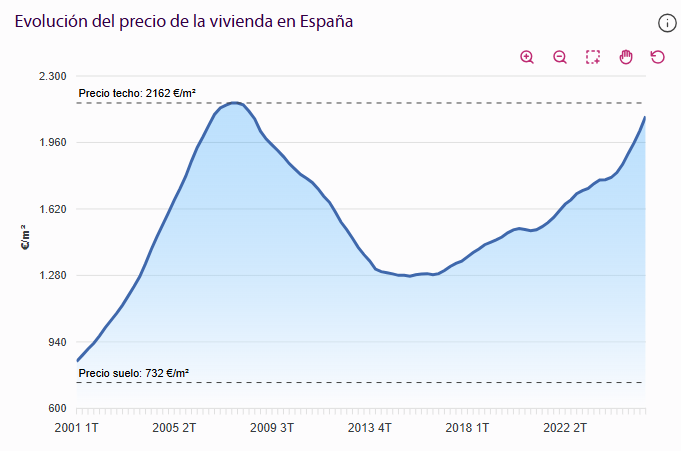 Y en términos reales (considerando la inflación), aún estamos relativamente lejos del precio alcanzado en la burbuja financiera (considerando el total de vivienda nueva y de segunda mano).