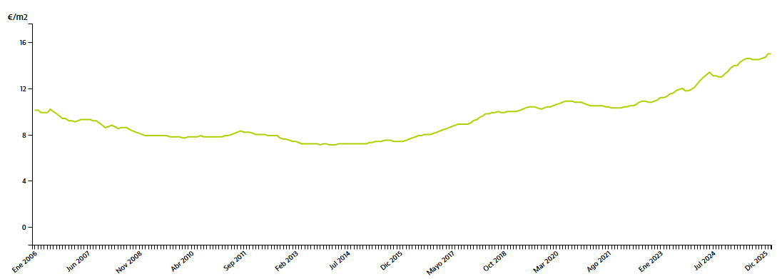 Pues se muestra en el siguiente gráfico, la evolución del precio del alquiler en España no ha dejado de subir en los últimos años, situándonos actualmente en el máximo histórico (febrero del 2025), con 15€ el metro cuadrado, con un incremento anual en el último mes (febrero) del 7,8% respecto a febrero del 2025: