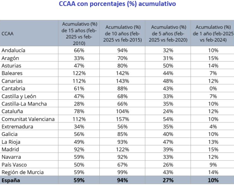 La divergencia es dispar según la Comunidad Autónoma, siendo la mayor revalorización en los últimos 10 años en la Comunidad Valenciana (157%, si bien en la capital habría sido del 185%):