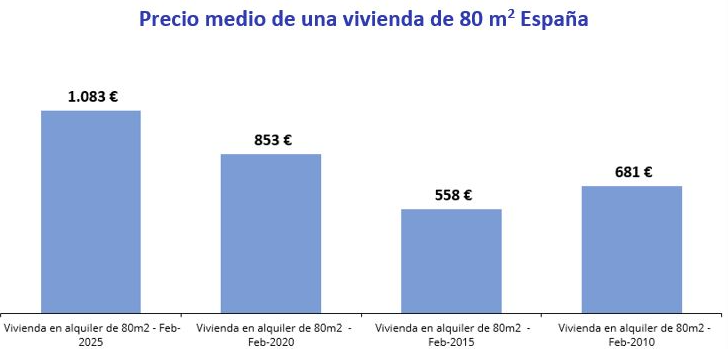 Otra forma de verlo es en función del pago de media por el alquiler de una vivienda de 80 metros cuadrados en el mismo rango de tiempo (pago actual, hace 5, 10 y 15 años):