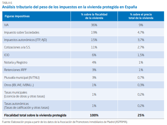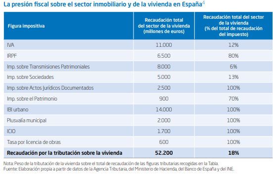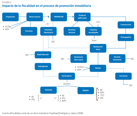 Así, desde que se inicia la compra de suelo para la construcción de la vivienda por parte del promotor, hasta que se llega a su adquisición por parte del comprador final, pueden llegarse a pagar hasta por un total de 16 figuras tributarias (IVA, Impuesto de Transmisiones Patrimoniales (ITP), Actos Jurídicos Documentados (AJD), licencias de obra, tasas municipales, plusvalías, IBI, IRPF por imputación de rentas, y hasta gravámenes autonómicos adicionales), siendo más grave cuando algunos impuestos gravan la misma operación en distintas fases, incrementando aún más el precio final de la vivienda: