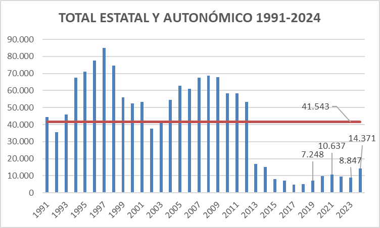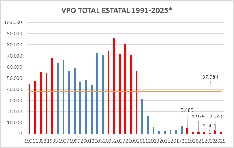 Estamos hablando de niveles en mínimos históricos (el promedio 1991-2025 es de 37.984 viviendas) equivalente a un 7-8% del promedio histórico, no construyéndose apenas vivienda pública desde el 2012.