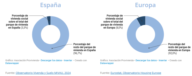 La comparación con Europa tampoco nos deja en buen lugar. En España solo el 3,3% del parque de vivienda corresponde a vivienda social, cifra notablemente inferior al 8% de la media europea (donde destacan países como Países Bajos con más del 30% o Austria o Dinamarca con el 20%). Esto supone una barrera a la hora de facilitar vivienda asequible a las personas en situación de vulnerabilidad y con dificultades para acceder a una vivienda en el mercado (mientras se está trasladando esta responsabilidad al propietario privado a través de la okupación y otro tipo de leyes).