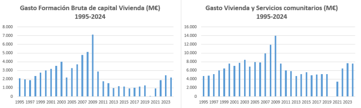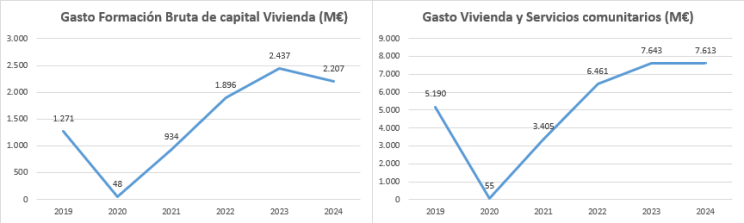 Así, el gasto más propiamente de construcción de vivienda (formación bruta de capital en vivienda) ascendió a 2.207M € en 2024, mientras que el total de gasto en vivienda y servicios comunitarios (incluye urbanismo/desarrollo comunitario, agua, alumbrado…) fue de 7.613M €.