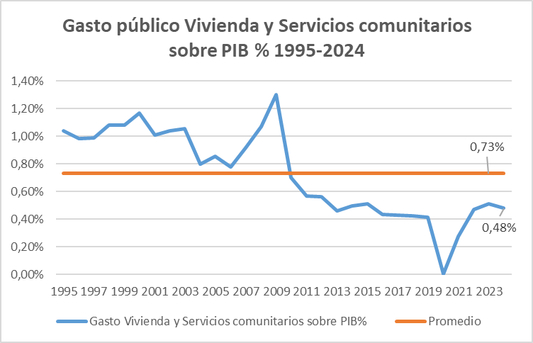 A continuación, muestro el gasto público en Vivienda y Servicios comunitarios (alumbrado, abastecimiento de agua…), que alcanzó el 0,48% sobre el PIB en 2024, muy por debajo del promedio de los últimos 30 años (0,73%).