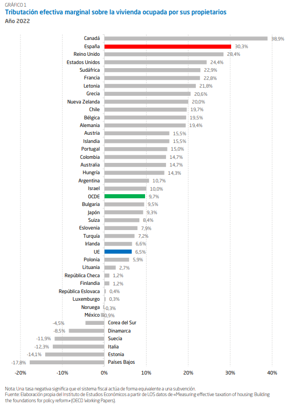 Como muestra el informe del Instituto de Estudios Económicos (IEE), hablamos de que la fiscalidad total sobre la vivienda supone un sobrecoste medio del 25% sobre el precio final de la misma: