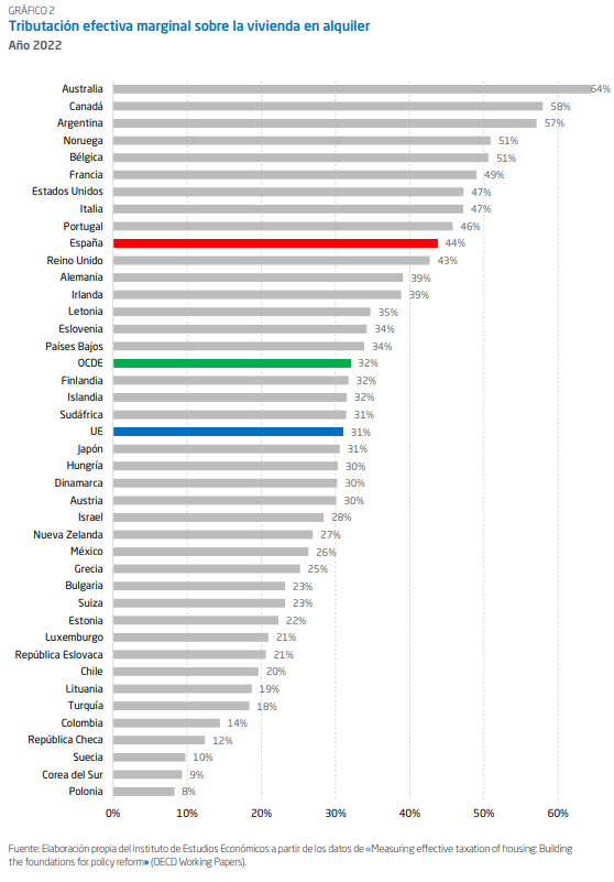 Y en el siguiente gráfico se muestra la tributación efectiva marginal sobre la vivienda en alquiler, que alcanza en España el 44%, frente a un promedio de la UE del 31% o de la OCDE del 32%: