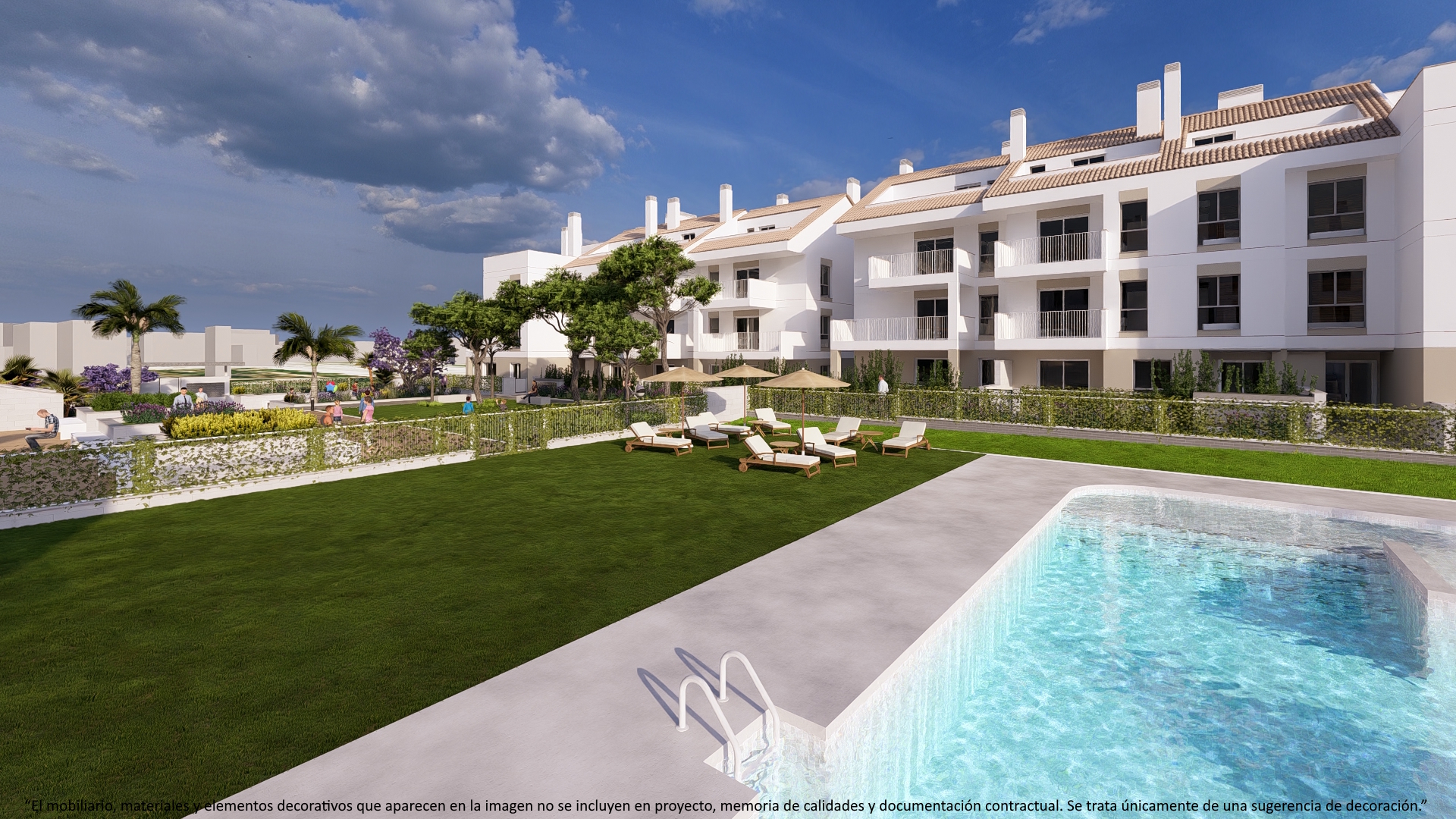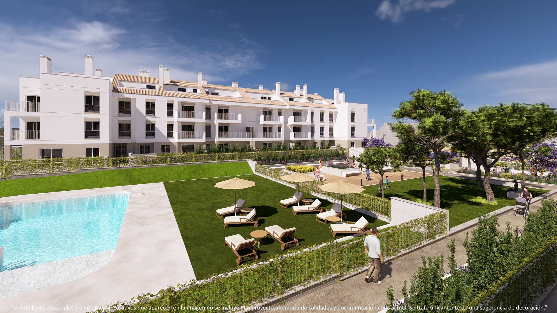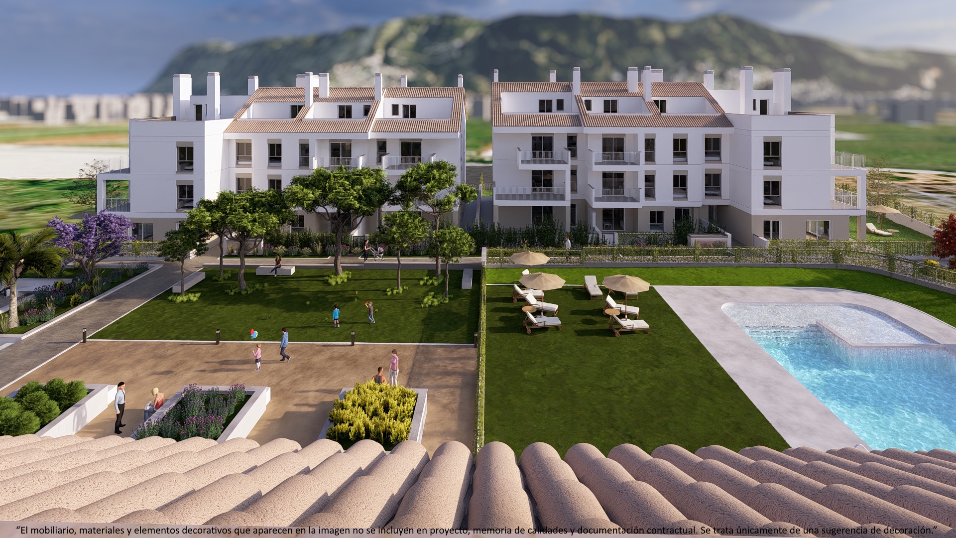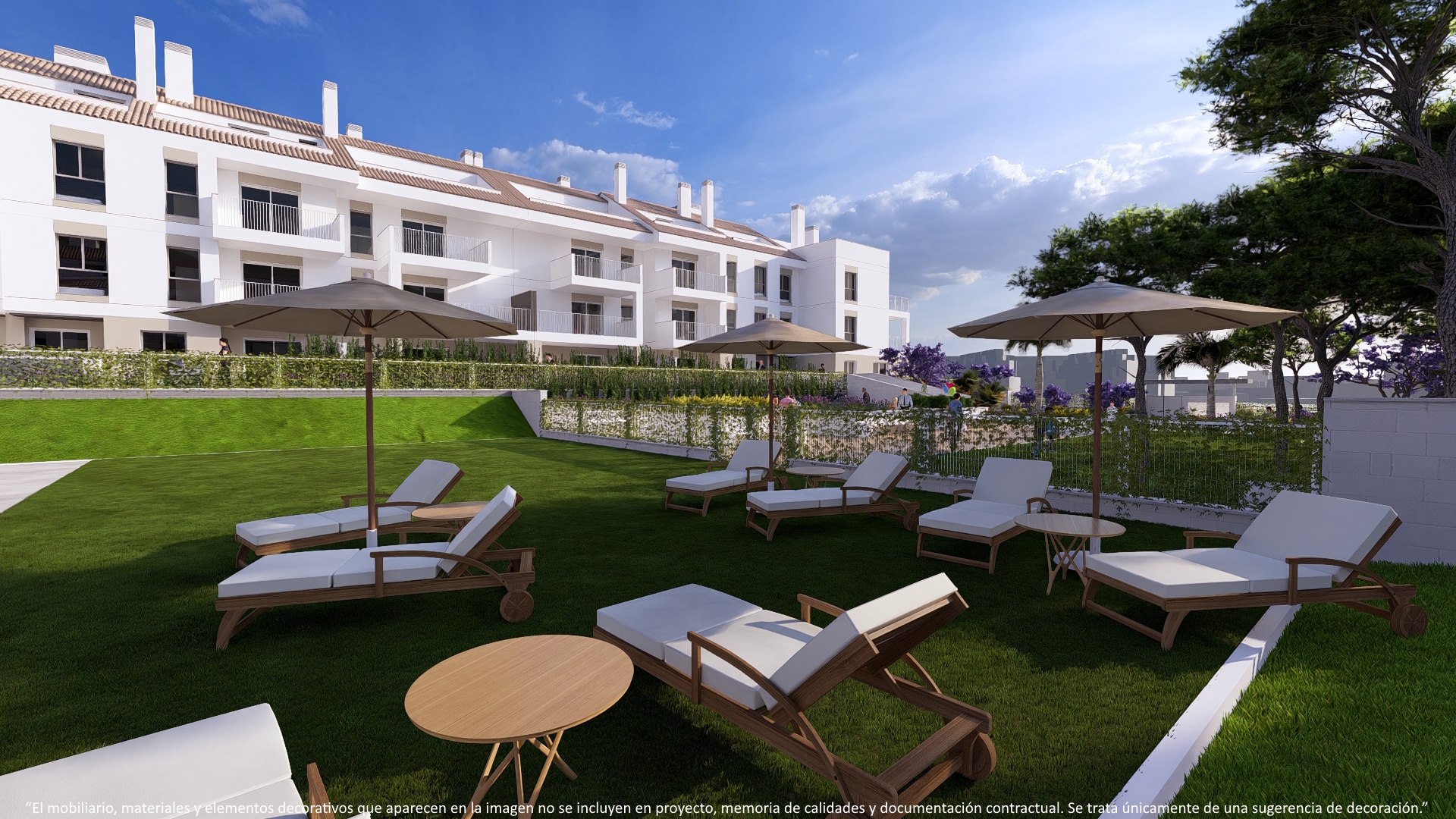 Residencial con piscina, grandes terrazas, espacios verdes y vistas al Montgó